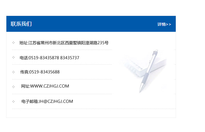 地址:常州市新北區友邦商務大廈1幢16、17層  電話:0519-85101652  傳真:0519-85112595  郵編:213022  網址:www_cz-jiayue_cn.ccjunming.com  郵箱:xiajifengaa@163.com